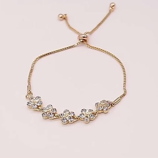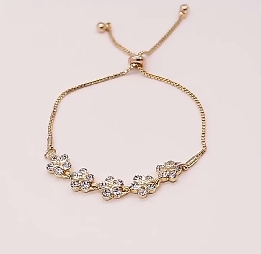Introducing the Crystal Star Flower bracelet: a stunning gold colored stainless steel accessory adorned with a blooming crystal flower. Enjoy adjustable sizing and a slide lock for easy wear. Perfect for adding a touch of elegance to any outfit.