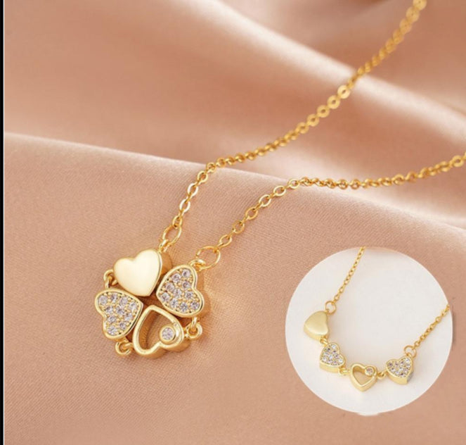 The Love Connection necklace features four hearts that can be worn connected as a clover or separately, offering versatility and personalization. Adorned with sparkling crystals, this adjustable necklace is a sweet and stylish addition to any outfit. Experience the beauty and charm of connection with Love Connection.