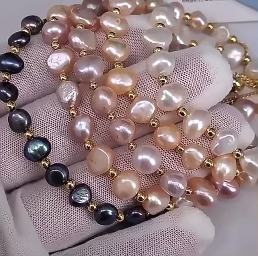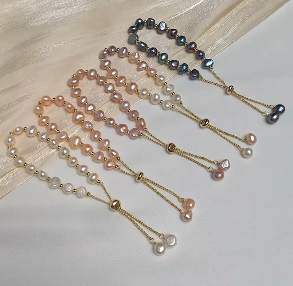 Discover the beauty of 6-8mm Natural Freshwater Baroque Pearls as they grace your wrist on a gold stainless steel adjustable chain bracelet. Each pearl is unique, adding a touch of elegance to any ensemble. Experience the natural radiance and unmatched sophistication of these timeless gems.