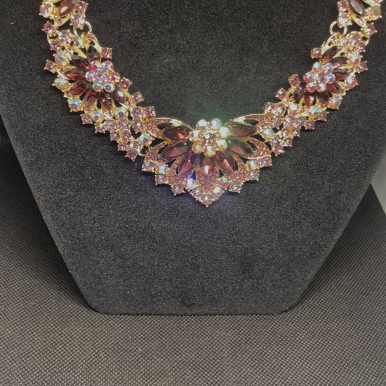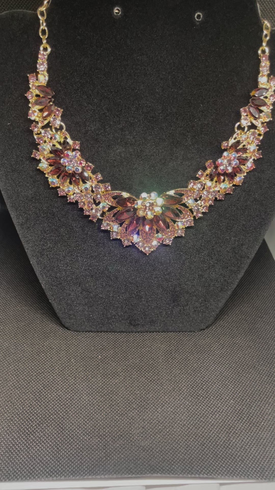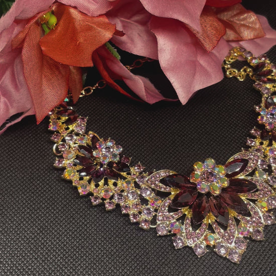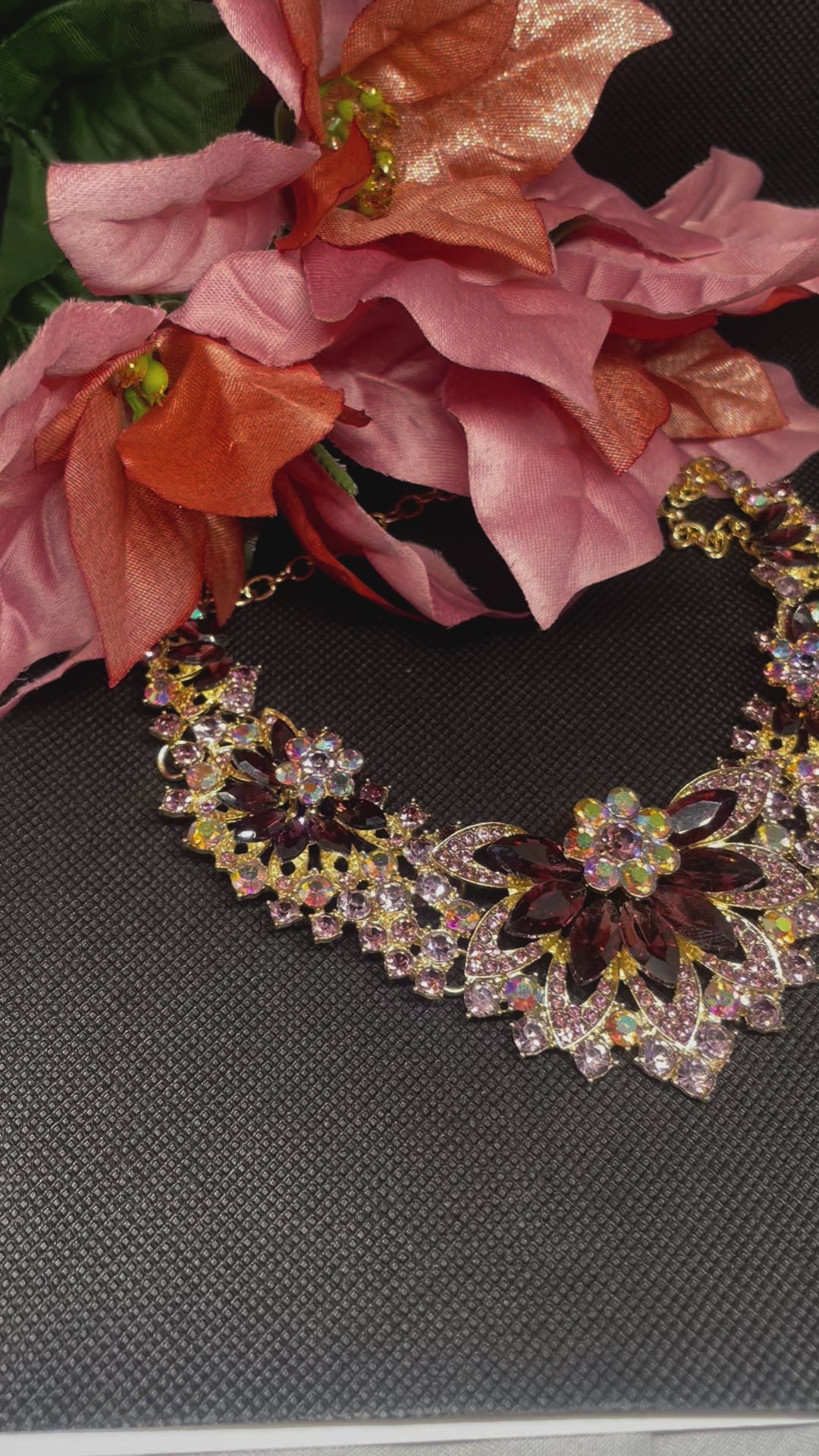 Elevate your look with PLUM IN SPARKLE. This stunning necklace boasts a plum costume pendant surrounded by sparkling crystal rhinestones. Perfectly combining elegance and boldness, it's guaranteed to add a touch of glamour to any outfit.