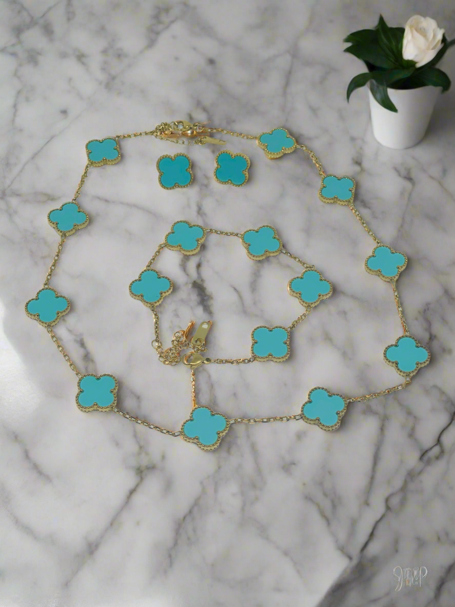 Crafted with high-quality 316 Stainless Steel, this Teal Clover Set is both stylish and durable. Its unique four leaf clover design adds a touch of luck to any outfit. Resistant to tarnishing, it's the perfect accessory for any occasion.